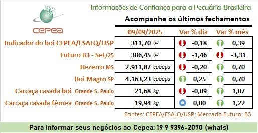 Estabilidade de preços e escalas mais longas: nessa terça, a liquidez já esteve boa em várias regiões; em SP, no entanto, alguns frigoríficos estiveram fora de compra e pecuaristas também estão resistentes, aguardando reajustes. Os negócios continuam se concentrando na faixa de R$ 310 a R$ 315. Alguns chegam a R$ 320, mas houve vendas também a R$ 305. Os preços mais altos continuam em MS, nos R$ 320. Em Dourados, fêmeas tiveram reajuste de cinco reais na arroba. Por lá, as escalas estão mais curtas, entre 7 e 12 dias. Em MT, os preços seguem no mesmo patamar desde o final de agosto. No Triângulo Mineiro, as escalas estão para o final do mês. Reposição mantém preços firmes, em tendência de alta. Carne no atacado da Grande SP, em estabilidade. Carcaça casada de boi teve média à vista de R$ 21,68/kg nessa terça. (Cepea)
