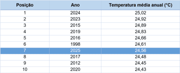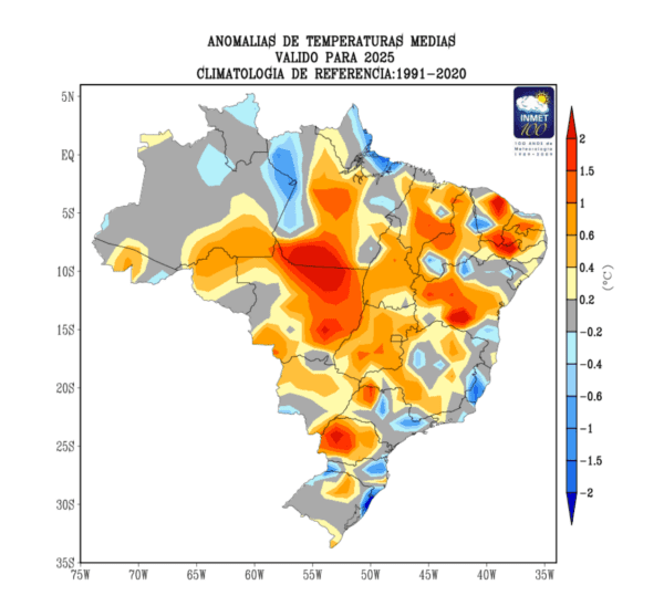 A temperatura média anual do Brasil em 2025 atingiu 24,56 °C, ficando 0,33 °C acima da média histórica, segundo dados do Instituto Nacional de Meteorologia (INMET.) O resultado coloca 2025 como o sétimo ano mais quente da série iniciada em 1961. O recorde nacional segue com 2024, quando a média chegou a 25,02 °C, 0,79 °C acima do padrão climatológico.
